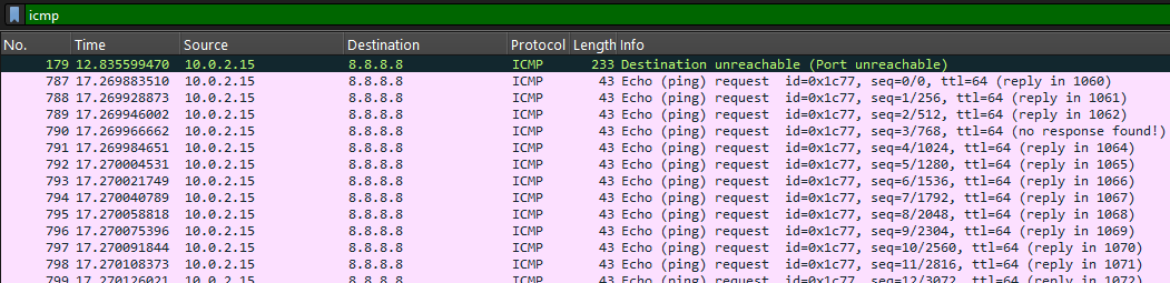 Examining the PCAP in Wireshark reveals some uninteresting DNS requests, QUIC traffic, TLS web communications, and a huge block of ICMP traffic: