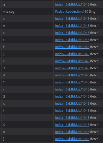 The challenge provides a URL. Loading the URL with the DevTools Network pane open, it’s apparent that the flag is being returned character-by-character as requests originating from a JavaScript file: